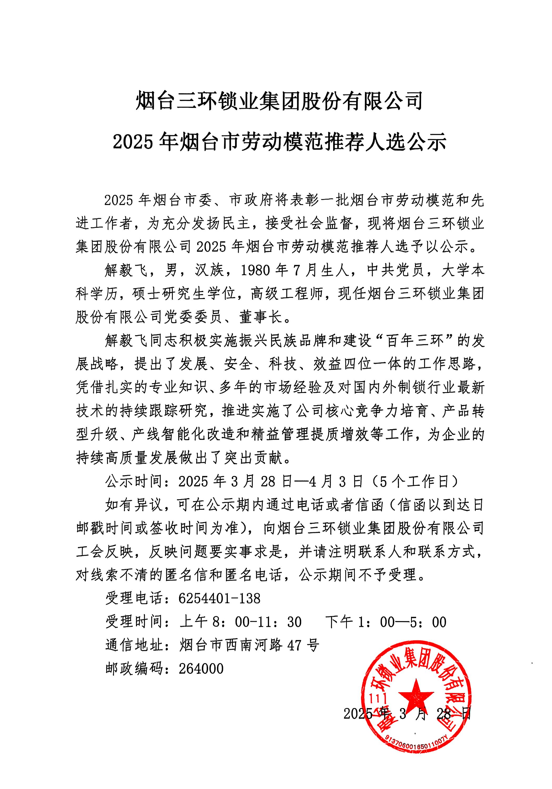 煙臺三環(huán)鎖業(yè)集團股份有限公司 2025年煙臺市勞動模范推薦人選公示